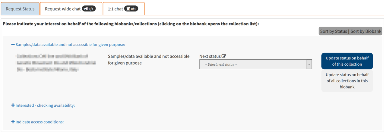The second important feature is the ability to sort collections/biobanks based on their indicated status (= e.g., availability of material/data). This is particularly important if you have negotiations with many collections/biobanks.